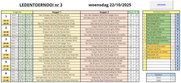 Programma 2025 We hernemen ook onze clubtornooien. 1.  woensdag 26 februari van 20u00 tot 21u45 2.  woensdag 2 april van 20u00 tot 21u45 3.  woensdag 22 oktober van 20u00 tot 21u45 We hebben gisteren ons derde clubtornooi afgewerkt. We waren met 16 deelnemers op 4 terreinen Per gewonnen wedstrijd 3 punten of beiden hebben 5 van hun 6 wedstrijden winnend afgesloten