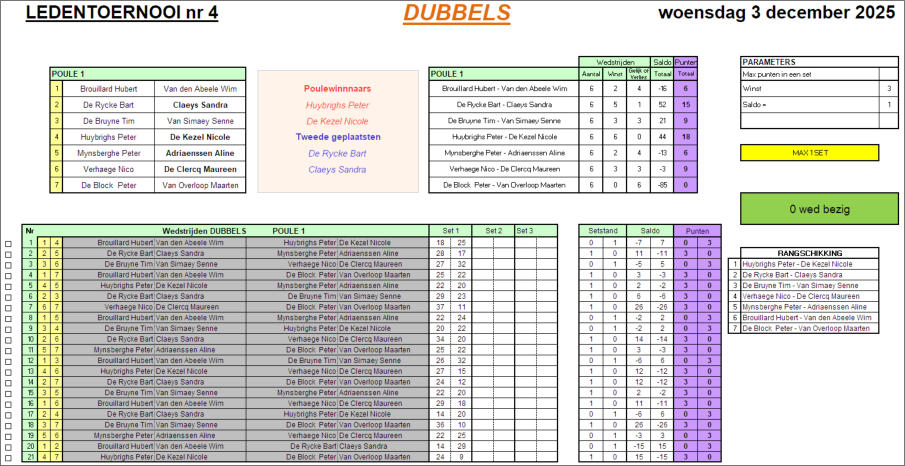 Na zes wedstrijden bleken Nicole en Peter ongeslagen en daarmee duidelijk het sterkste koppel van de avond. Sandra en Bart eindigden op de tweede plaats met één wedstrijd minder gewonnen. Voor het eindklassement van 2025 was er bij de dames geen maat op Sandra. Zij was in drie van de vier tornooien de beste van de klas. Maar nog sterker is dat Sandra gewoonweg de meeste punten behaalde van alle spelers Bij de heren werd tijdens het tornooi stilaan duidelijk dat er een verrassing in de maak was. Peter M, die na drie tornooien aan de leiding stond met 39 punten, werd gevolgd door Michaël met 33 punten, Bart met 32 punten en Peter H met 29 punten. Er waren nog 18 punten te verdienen, en Bart en Peter H wisten hun achterstand goed te maken in de laatste wedstrijd van de avond. Uiteindelijk kwamen Bart en Peter H allebei uit op 47 punten, waardoor het totaal aantal gescoorde punten uit alle tornooien doorslaggevend werd. Peter M zakte verrassend weg naar de derde plaats. Bart scoorde in totaal 655 punten, terwijl Peter H op 585 punten uitkwam.