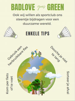 Als badmintonclub stellen wij jullie het volgende voor: Wij brengen allemaal ons drinken mee naar de sporthal. Dit zou je ook kunnen doen in een ‘herbruikbare’ fles zodat we samen het gebruik van de PET-flessen helpen verminderen. Indien mogelijk kan men ook met de fiets naar de sporthal komen. Het voordeel is dat je niet meer moet opwarmen als je arriveert. Minder autogebruik, minder broeikasgassen, gezonder voor ons allemaal. Ook belangrijk is dat men alle afval in de juiste vuilbakken gooit. Sorteren op de correcte manier is iets dat wij in Vlaanderen al langer kennen. En voor de diehards onder ons, die mogen altijd douchen met ‘koud’ water’ Dit komt ten goede aan het energieverbruik van de sporthal. Wij hopen hiermee als club een beetje bij te dragen tot de algemene bewustwording rond duurzaamheid.
