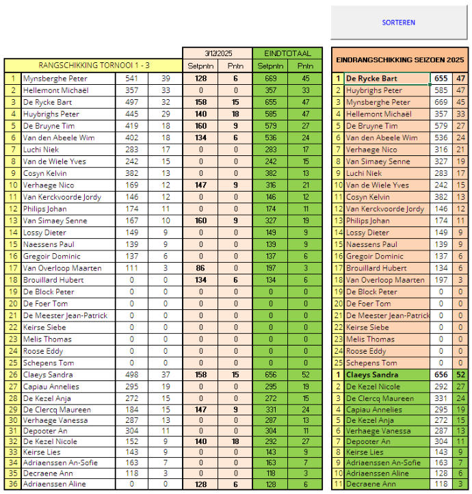 Na zes wedstrijden bleken Nicole en Peter ongeslagen en daarmee duidelijk het sterkste koppel van de avond. Sandra en Bart eindigden op de tweede plaats met één wedstrijd minder gewonnen. Voor het eindklassement van 2025 was er bij de dames geen maat op Sandra. Zij was in drie van de vier tornooien de beste van de klas. Maar nog sterker is dat Sandra gewoonweg de meeste punten behaalde van alle spelers Bij de heren werd tijdens het tornooi stilaan duidelijk dat er een verrassing in de maak was. Peter M, die na drie tornooien aan de leiding stond met 39 punten, werd gevolgd door Michaël met 33 punten, Bart met 32 punten en Peter H met 29 punten. Er waren nog 18 punten te verdienen, en Bart en Peter H wisten hun achterstand goed te maken in de laatste wedstrijd van de avond. Uiteindelijk kwamen Bart en Peter H allebei uit op 47 punten, waardoor het totaal aantal gescoorde punten uit alle tornooien doorslaggevend werd. Peter M zakte verrassend weg naar de derde plaats. Bart scoorde in totaal 655 punten, terwijl Peter H op 585 punten uitkwam.