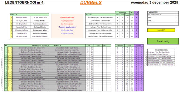 Programma 2025 We hernemen ook onze clubtornooien. 1.  woensdag 26 februari van 20u00 tot 21u45 2.  woensdag 2 april van 20u00 tot 21u45 3.  woensdag 22 oktober van 20u00 tot 21u45 4.  woensdag 3 december van 20u00 tot 21u45 Het laatste clubtornooi van 2025 is gespeeld.  We speelden dit jaar voor de eerste keer met een ‘vaste’ partner. Iedereen speelde 6 wedstrijden van +/- 12 minuten op 3 terreinen. Per cyclus van 3 wedstrijden was er telkens één koppel in rust. De puntentelling was identiek als in de vorige 3 tornooien: bij winst 3 punten en 1 punt bij gelijkspel. De gescoorde punten werden eveneens onthouden om bij gelijke stand een onderscheid te kunnen maken…. En dat was blijkbaar nodig