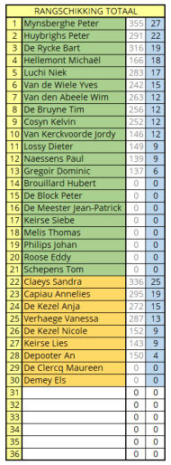Hoe werken deze tornooien1.Er zijn 2 systemen voorzien:oSysteem 1: We maken een klassering op basis van de behaalde punten per wedstrijd van elke deelnemer.oSysteem 2: We maken een klassering op basis van de gewonnen wedstrijden. ‘winst’ (= 3 punten) en ‘gelijkspel (= 1 punt) per gespeelde wedstrijd van elke deelnemer. De gescoorde punten worden ook bijgehouden maar enkel om een rangschikking te kunnen maken bij gelijke punten.oWij spelen syteem 2 in 2025.2.Het tornooi vangt aan om 20u15.3.Na 13 minuten spelen wordt de wedstrijd gestopt en worden de behaalde punten doorgegeven aan de wedstrijdtafel.4.Er worden (meestal) 6 wedstrijden betwist wat betekent dat we spelen tot 21u45 of +/- 75 minuten wedstrijd per speler.5.In de tabel rechts van de wedstrijden ziet men in de ‘blauwe’ kolom de behaalde punten van de avond (maximaal : 6 wedstrijden X 3 punten = 18 punten).Het kolommetje links ervan toont de gescoorde punten van de avond.6.Na de 6 wedstrijden is er een ‘beste’ heer en dame van ‘de avond’.7.En de grote kolom hiernaast toont de “TOTALE RANGSCHIKKING” over 2025Maar het belangrijkste is natuurlijk dat iedereen zich amuseert en met 6 verschillende partners tegen telkens 6 andere koppels speelt.